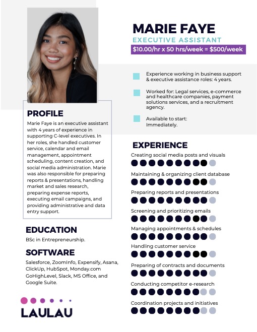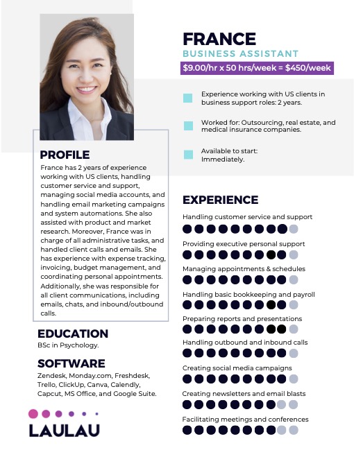 Meet top candidates tailored to your needs. Your chosen assistant will work and report directly to you during your business hours.