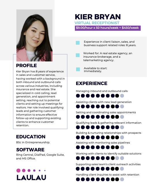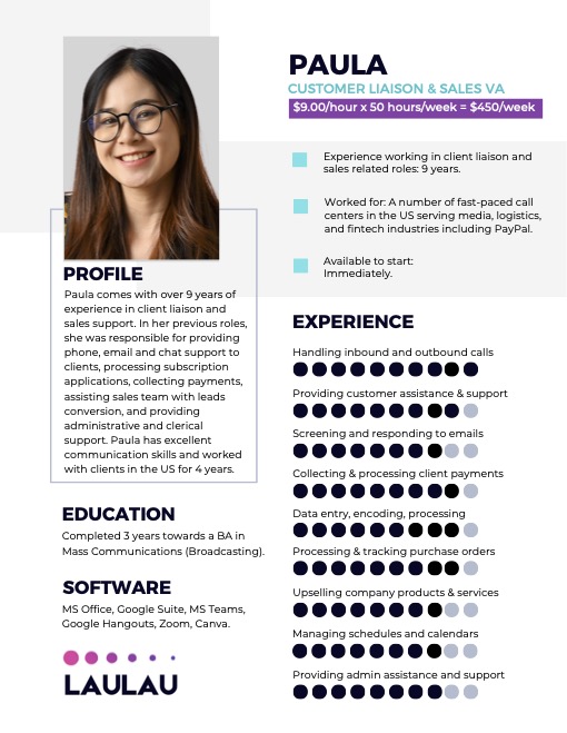 Talk to Us TodayWe have been helping small business owners save money and time on staffing for over a decade, and offer all types of full-time, experienced remote professionals from the Philippines and Colombia. Please select what type of support you are looking for to see our rates, meet some of our candidates, and find out how it works.