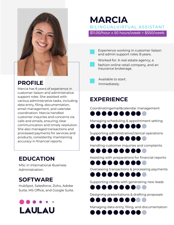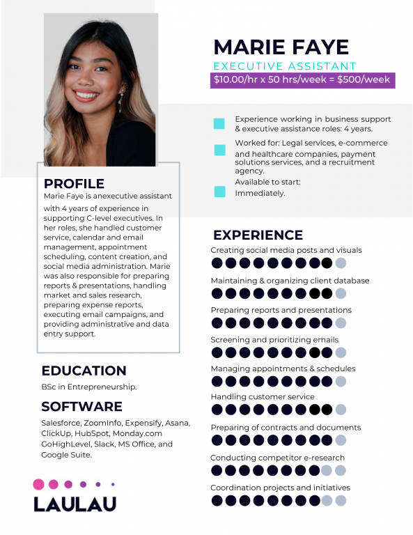 "We love working with LauLau assistants and highly recommend them. The team is very responsive, warm, and experienced, and we couldn't be happier! This is my first experience working with a virtual assistant and they provided a lot of guidance and helped me to set everything up."