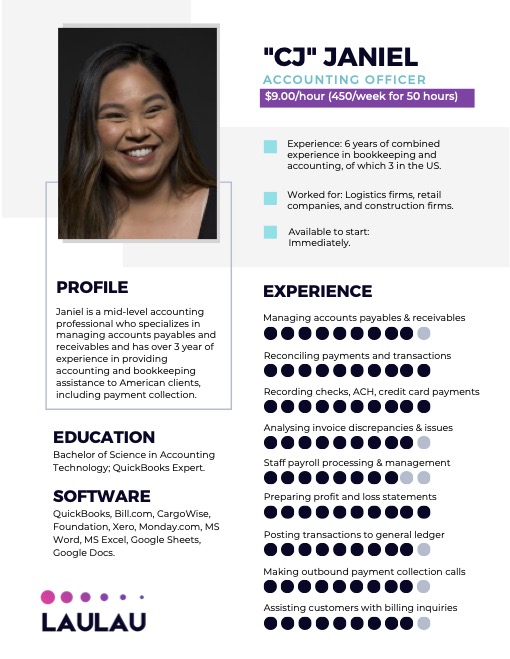 Did you know that 63% of accounting and bookkeeping firms overpay their staff and struggle to attract skilled professionals? We connect accounting firms with experienced specialists from Colombia and the Philippines. Call us today and we will help you reduce your payroll costs by up to 65%, cut your time to hire by 92%, and make sure you enjoy working with experienced accounting professionals hassle-free.