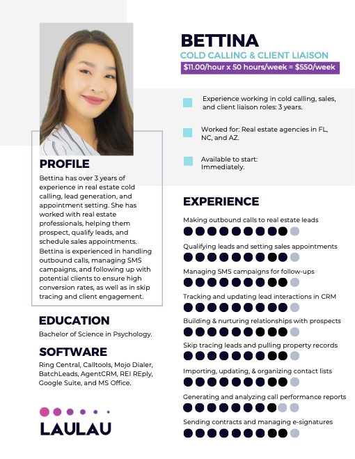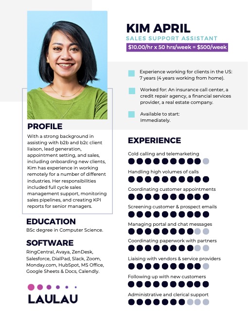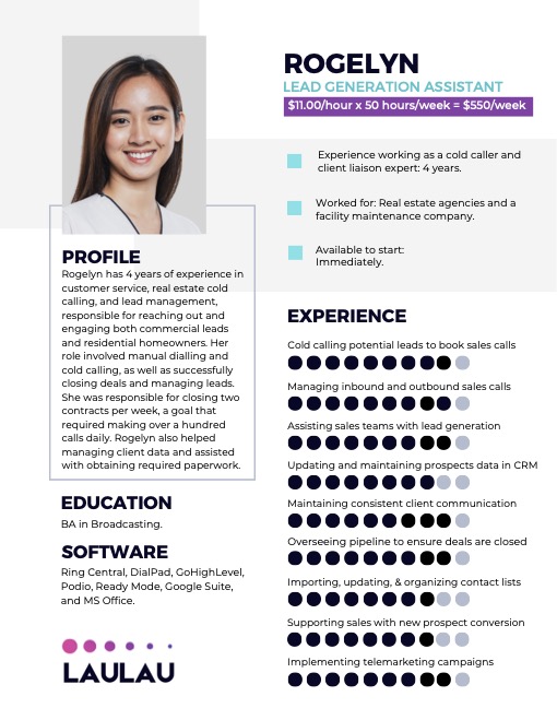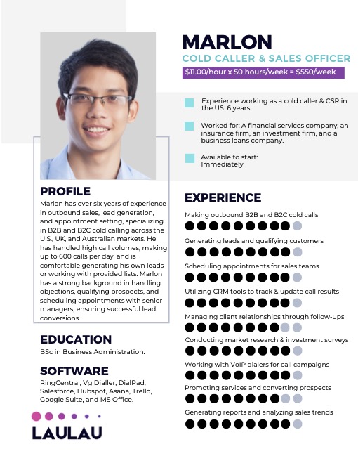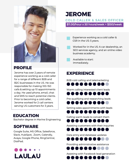 Did you know that 78% of small business owners overpay their staff and struggle to attract skilled professionals? Let us help you! We connect small and medium sized companies with experienced B2B and B2C cold callers, lead generation experts, and sales support assistants from Colombia and the Philippines to help them save money while hiring experienced staff who don’t need additional training. Our team members speak a very high level of English with no or minimal accent and have at least 2+ years of experience working in a similar role for a business in the US. Call us today and we will help you reduce your payroll costs, cut your time to hire, and make sure you enjoy working with fully trained and committed remote professionals.